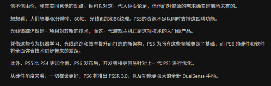 也有声音认为,从纯硬件角度出发,PS6几乎势必实现全面升级。例如PSSR 3.0可能会随主机同步推出,新一代DualSense手柄也有望带来更丰富的功能与交互体验。
