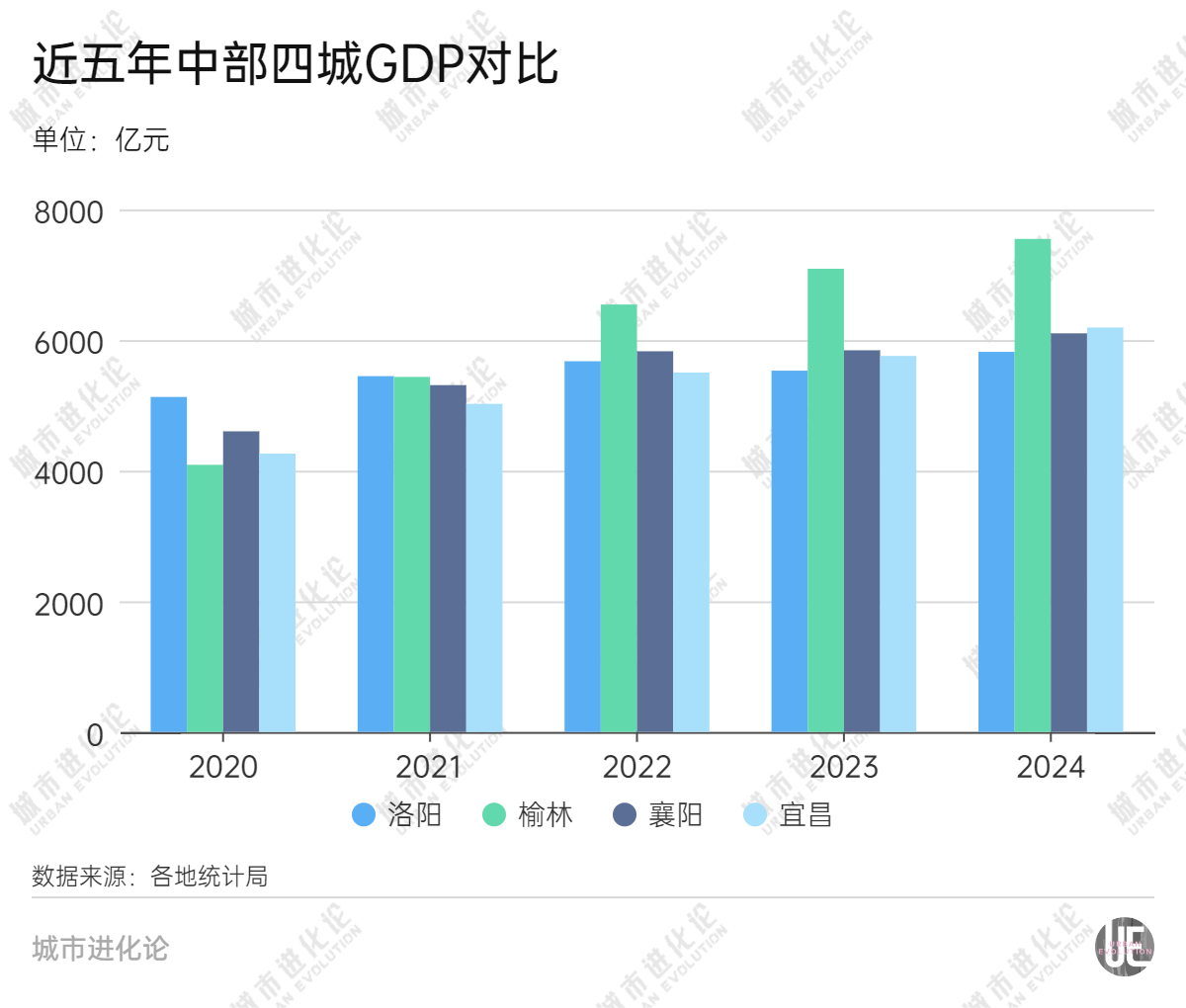 不过在2022到2023的两年时间内,洛阳接连被三座中西部城市赶超。2022年,榆林GDP超过洛阳;同一年,湖北襄阳GDP也超过了洛阳;第二年,湖北宜昌也实现反超。