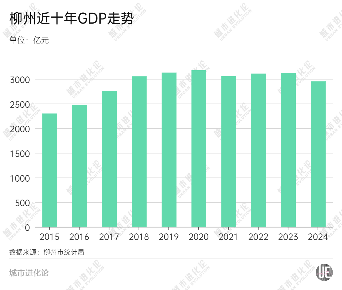如果将时间维度拉长,柳州GDP实际上已经多年停滞不前。从2018年起,柳州GDP就在上下浮动,没有形成实质的增长态势,2024年的GDP(2950.67亿元)甚至比2018年(3053.65亿元)更低。