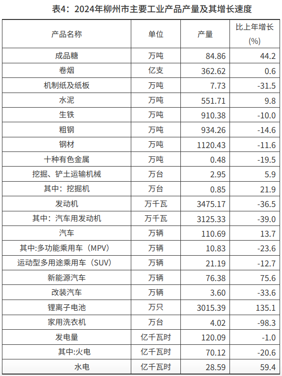 柳州2024年主要工业品产量,图片来源:柳州统计局
